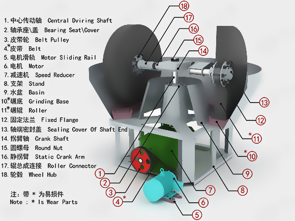 濕碾機(jī)采用輪動(dòng)式磨礦的工作方式:首先電動(dòng)機(jī)將動(dòng)力傳動(dòng)至減速機(jī),在減速機(jī)帶動(dòng)下,通過大立軸將力矩傳遞給上方的橫軸,然后經(jīng)安裝在橫軸兩端的拉桿傳遞至碾輪,使碾輪產(chǎn)生驅(qū)動(dòng)力,沿橫軸水平方向做逆時(shí)針旋轉(zhuǎn)運(yùn)動(dòng);工作時(shí)的碾輪既能圍繞濕碾機(jī)大立軸公轉(zhuǎn),又能圍繞碾輪中心軸進(jìn)行自轉(zhuǎn),碾盤則固定不動(dòng)。添加的礦石物料,在碾磨機(jī)內(nèi)受到來自碾輪自身重量帶來的擠壓力,碾輪公轉(zhuǎn)自轉(zhuǎn)時(shí)與碾盤產(chǎn)生的巨大摩擦力,在受到反復(fù)的擠壓、揉搓、研磨后,被徹底粉碎。